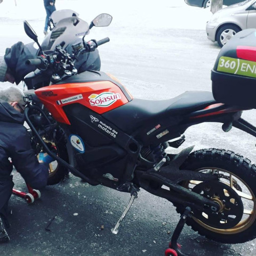 A 11h00, Sébastien SOHIER, conducteur de la moto Zéro DS, fait une pause obligatoire pour se réchauffer et sort une consommation de 58%, ce qui lui permettra de repartir jusqu'à la prochaine borne de recharge.