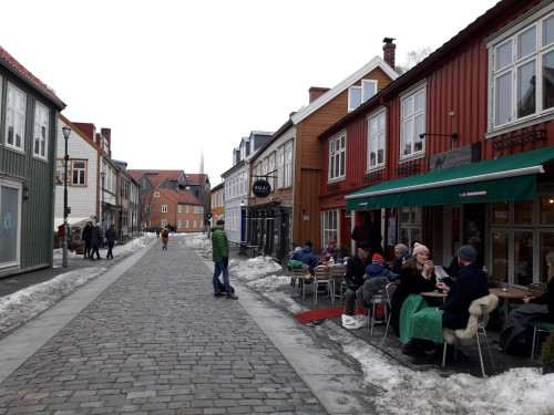 Deux heures après, la moto est rechargée et peut repartir pour rejoindre le groupe à Trondheim pour la pause déjeuner. Photos prises sur le pont des maisons multicolores. Au bord du pont, les participants ainsi que le staff ont pu se régaler avec un buffet servi dans un petit restaurant. Suite à la pause qui à été également l'occasion pour faire des photos et vidéos par notre caméraman, tout le monde repart vers 15h00 pour rejoindre la destination finale: STEINKJER.